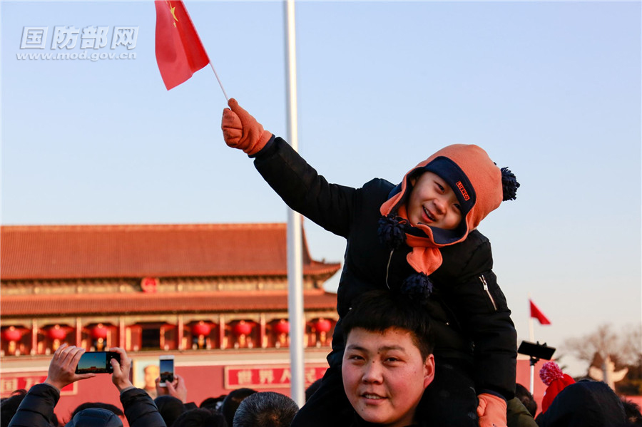 小朋友高兴地在天安门广场上挥起旗帜。中国军网记者 冯开华 摄