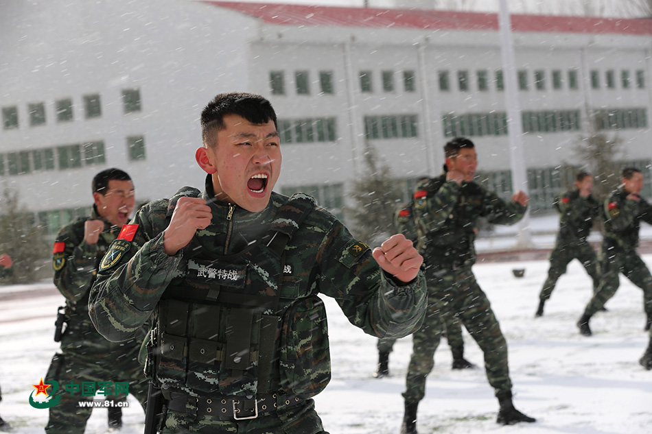 训练间隙,武警特战队员打拳进行热身。