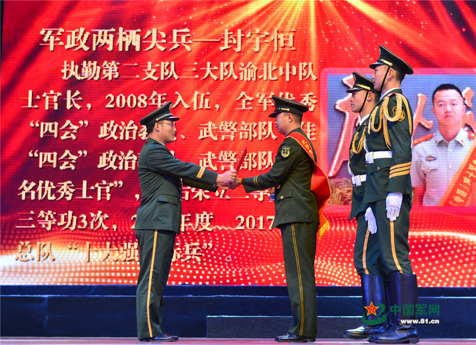 “中国武警十大忠诚卫士”孟宪辉为“十大强军标兵”封宇恒颁奖。