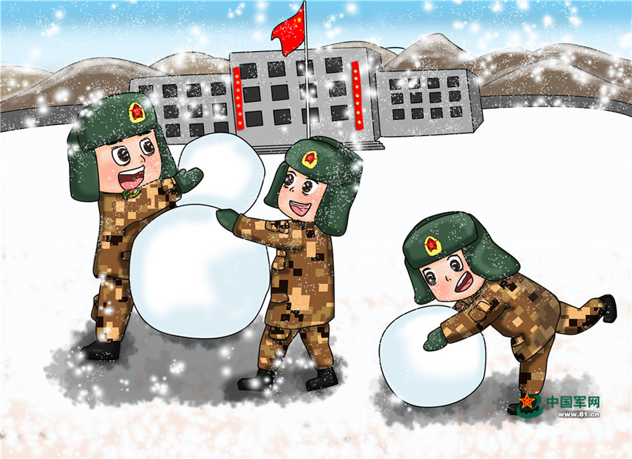 大雪过后,战士们堆雪人打雪仗,勾起了童年美好的回忆。
