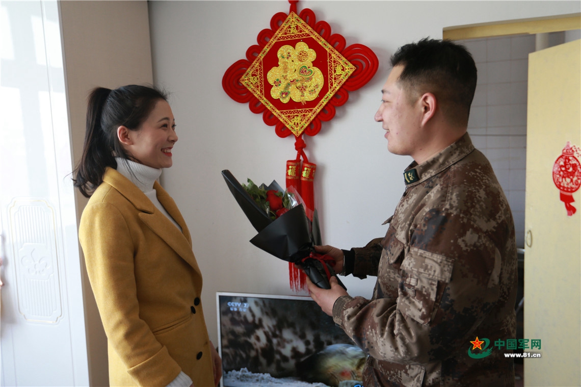 春节,陆军第76集团军某旅作战支援营警卫勤务连上士陈阳给对象送花。