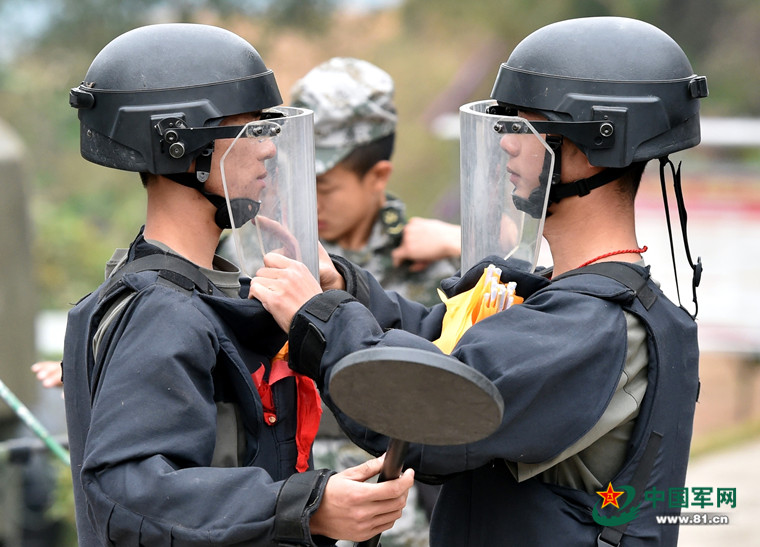 搜排手在互相检查防爆装备,准备进入雷场扫雷。