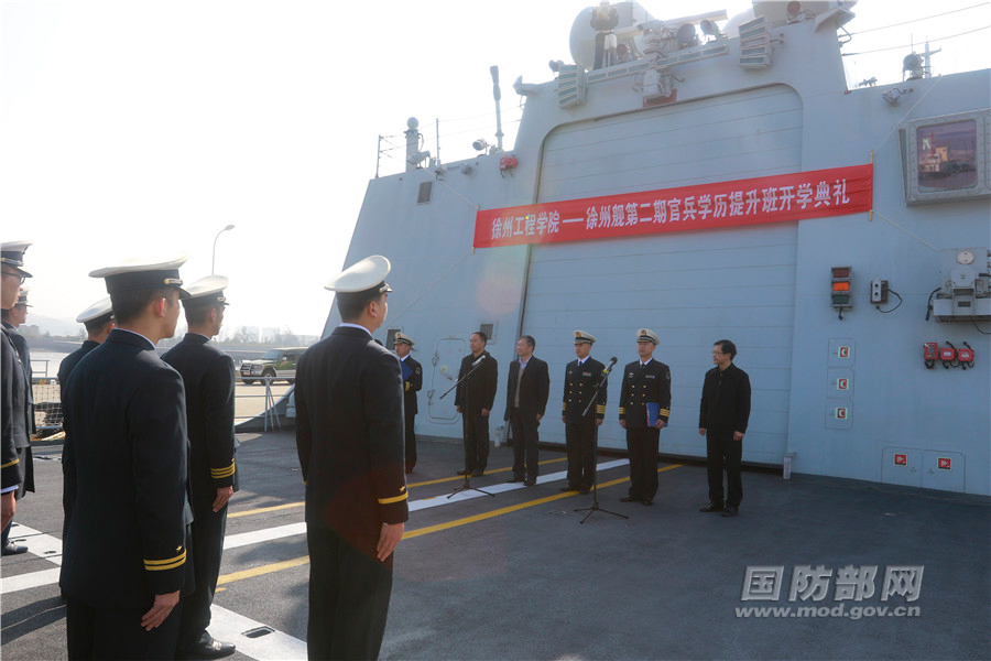 3月10日,由徐州工程学院和海军徐州舰共同举办的徐州舰第二期官兵学历提升班开学典礼,在海军东海舰队某驱逐舰支队徐州舰举行。