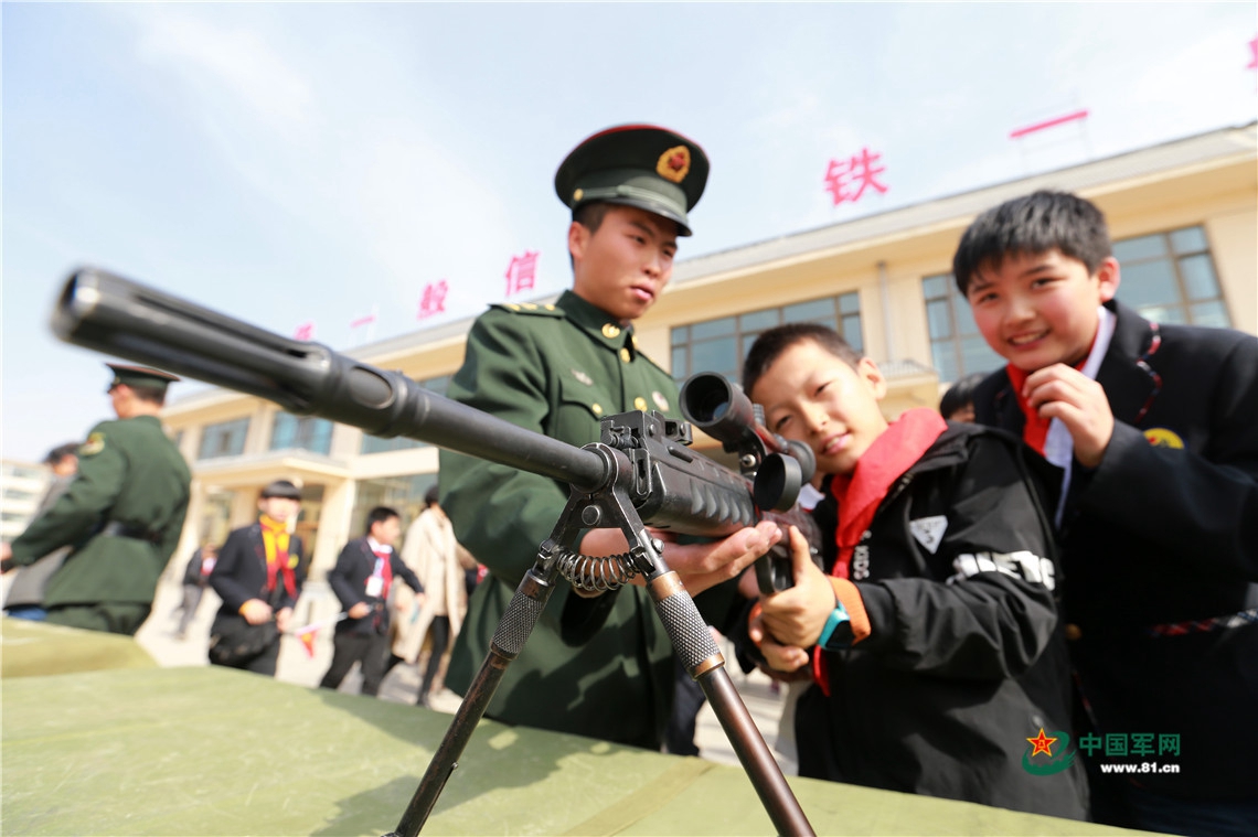 3月16日,陆军第76集团军某旅举行军营开放日,驻地百余名师生来部队过军事日,学生参观和体验操作武器装备。