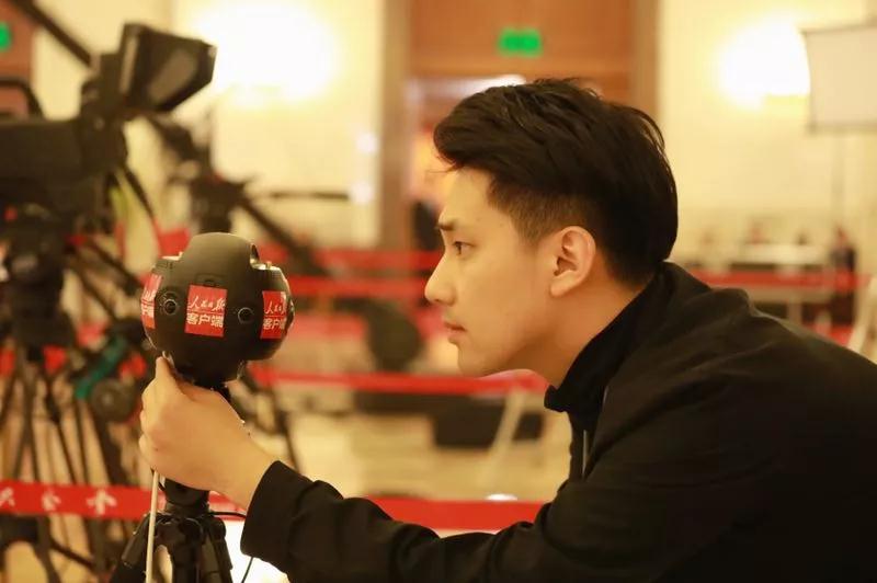 人民日报记者王靖远在前方为客户端直播调试全景相机。来源:金台新声