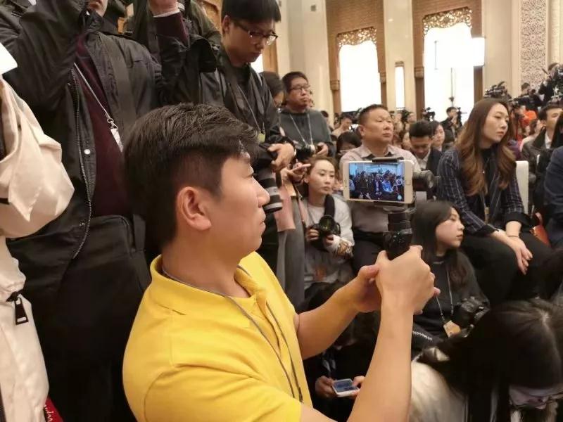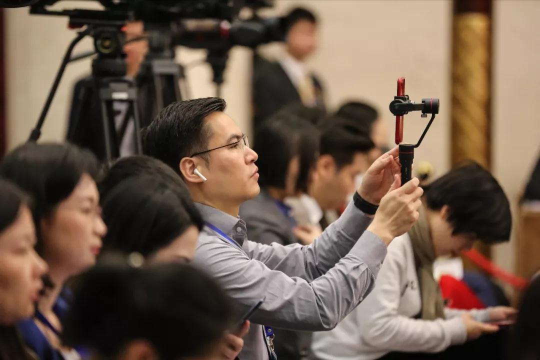 新华社记者用手持云台拍摄新闻发布会现场情况。