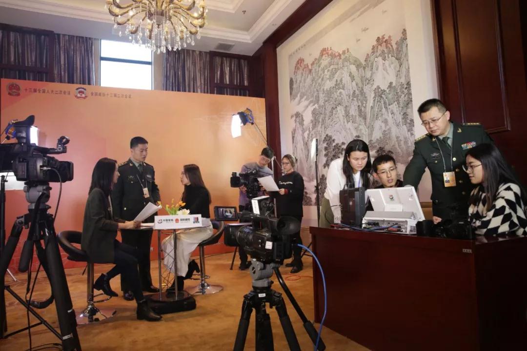 中国军网副总编辑曲延涛(右二)正在对两会嘉宾演播室采访画面进行审看指导。