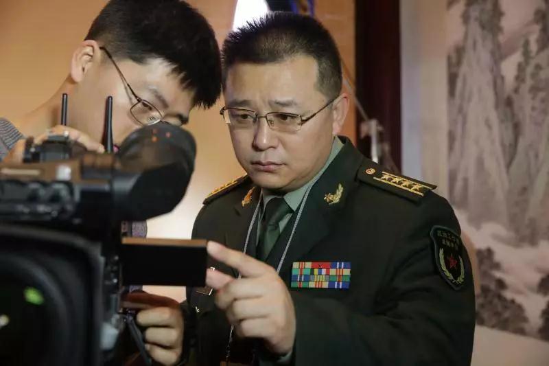 中国军网副总编辑曲延涛(右)正在两会嘉宾演播厅审看节目录制回放。