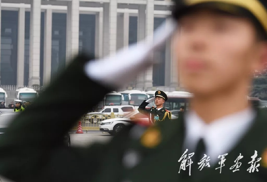 3月3日下午,全国政协十三届一次会议在北京人民大会堂隆重开幕。图为武警官兵在天安门广场执勤。