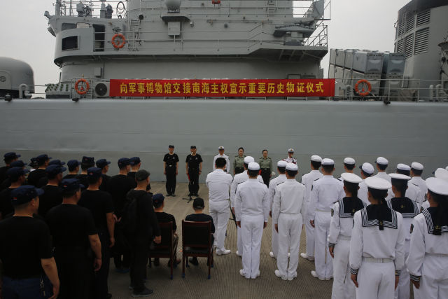 向中国人民革命军事博物馆交接南海主权宣示重要历史物证仪式近日在东部战区海军某护卫舰支队码头举行。海军原上海基地副司令员许志明、原某护卫舰大队政治委员李尧胜、原511舰执行任务老兵、中国人民革命军事博物馆文物征集人员和支队领导出席了仪式。