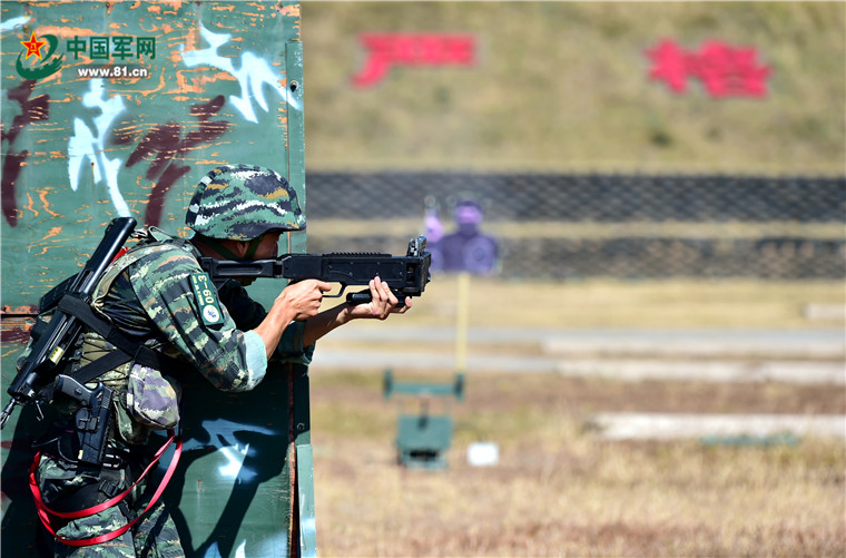 9月28日,在个人全能课目中,一名参赛队员利用拐角射击系统进行射击。曹峰 摄