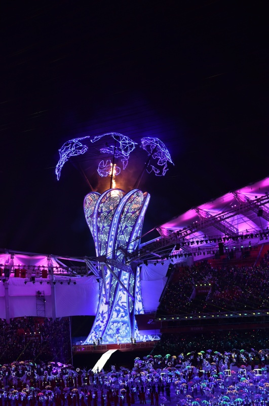 10月18日,第七届世界军人运动会开幕式在武汉体育中心举行。这是开幕式现场的主火炬塔。新华社记者 李贺 摄