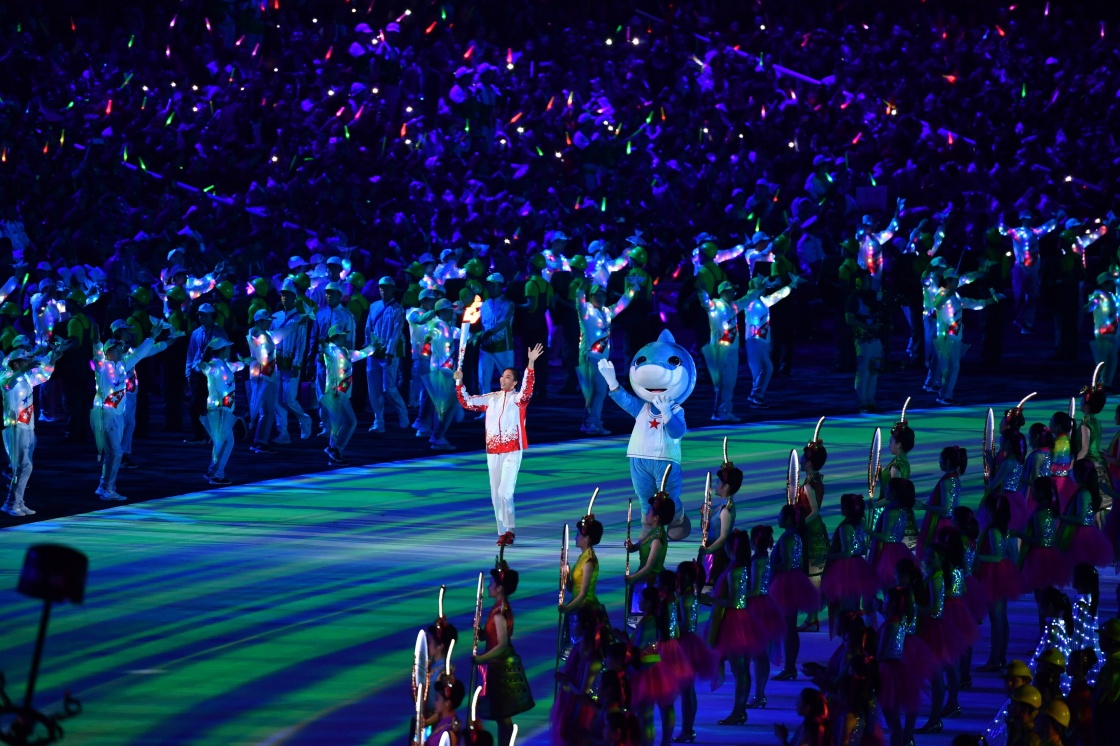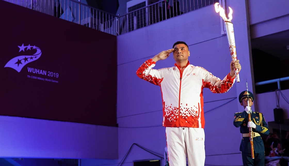 10月18日,火炬手刘玉栋在开幕式上。当日,第七届世界军人运动会开幕式在武汉体育中心举行。新华社记者金良快摄