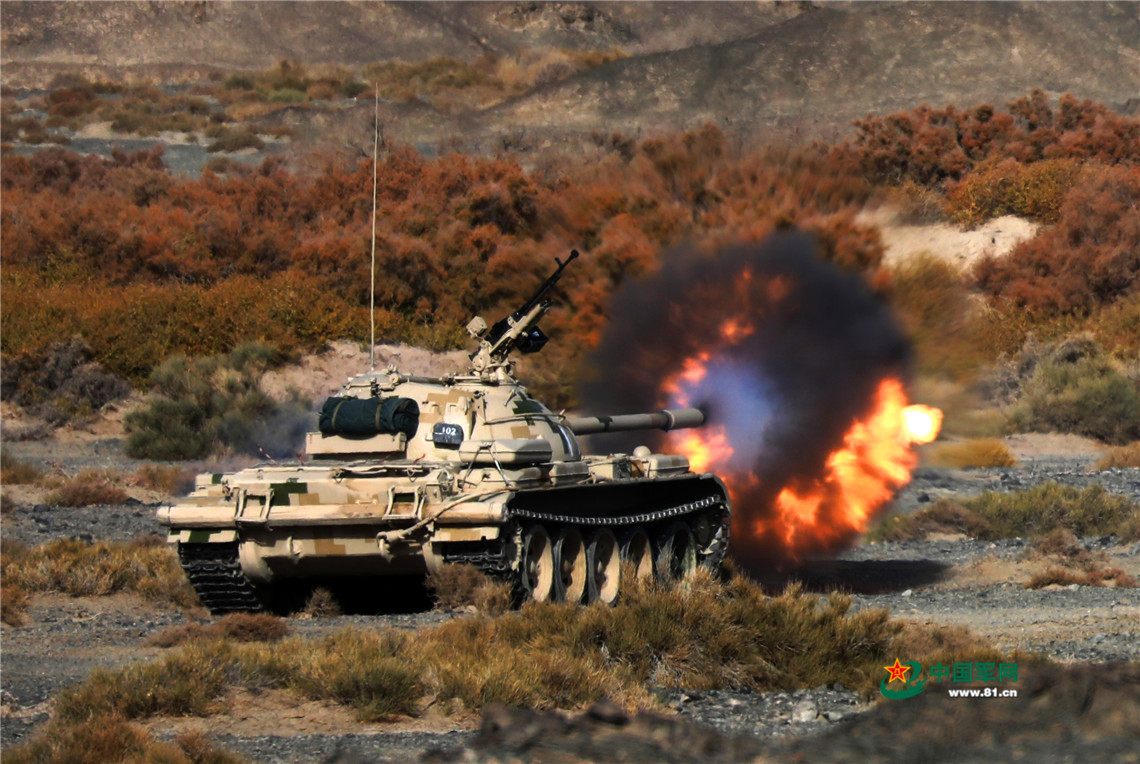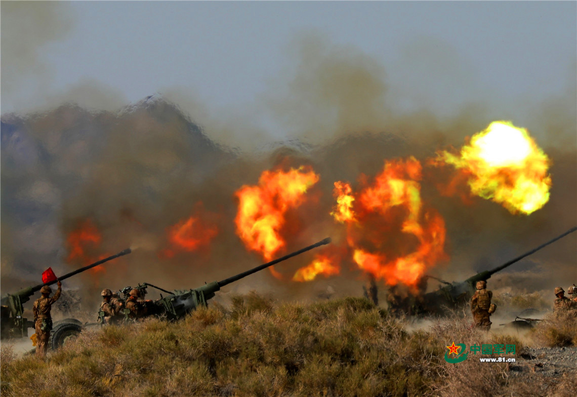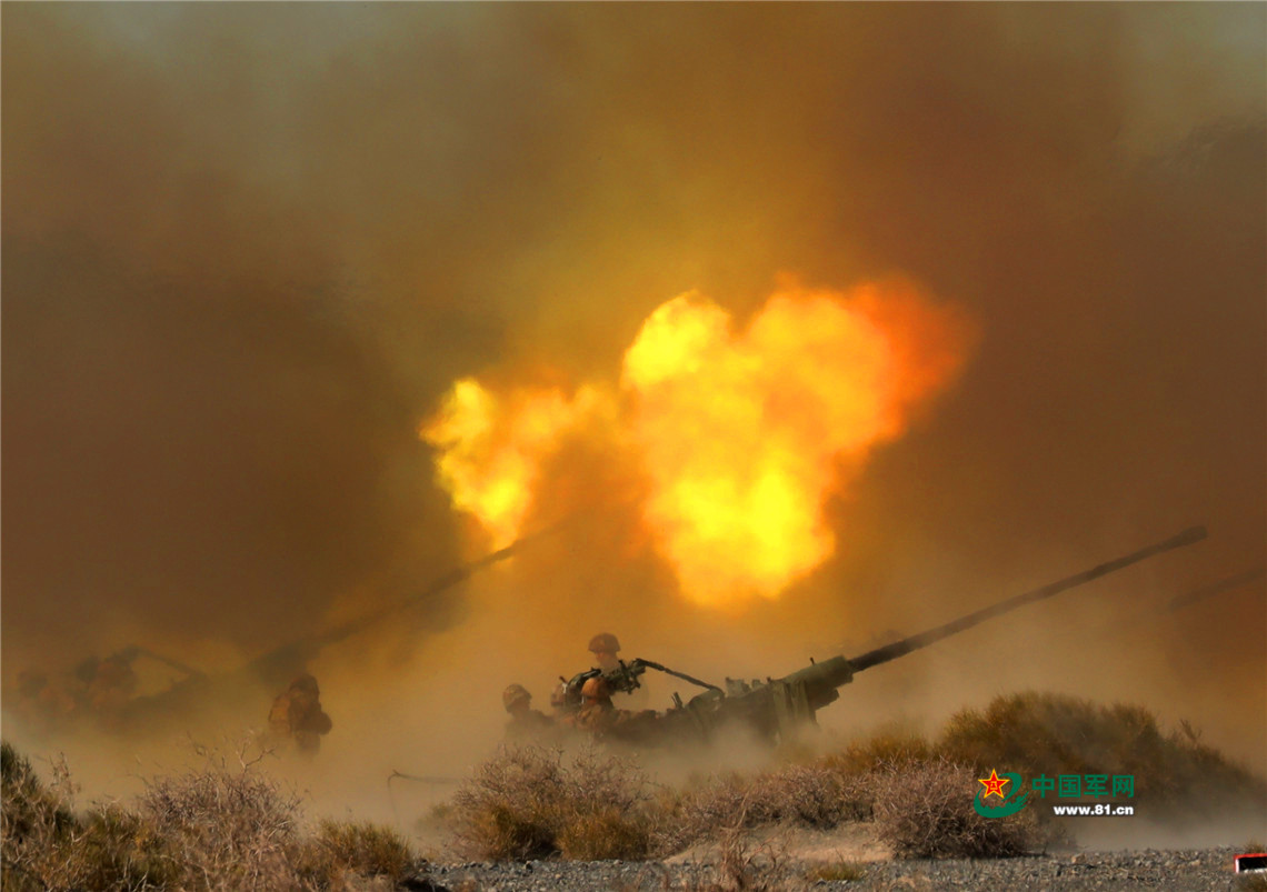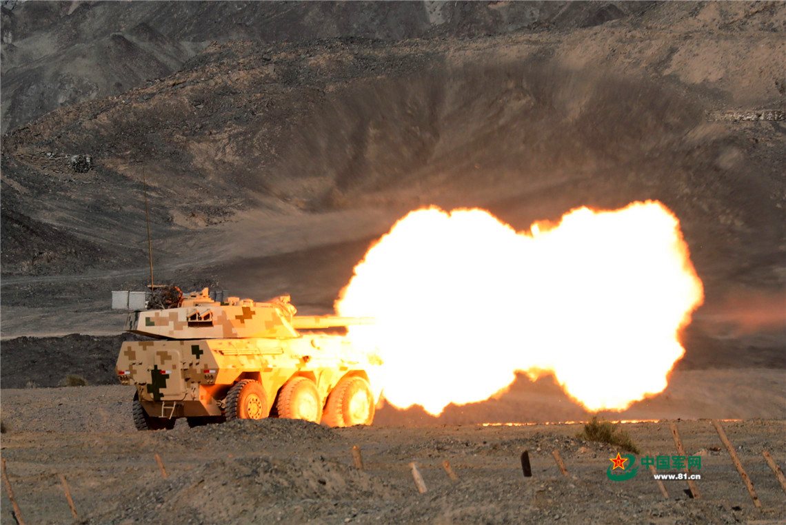 炮兵驾驶轮式步战车对远方目标进行火力打击。