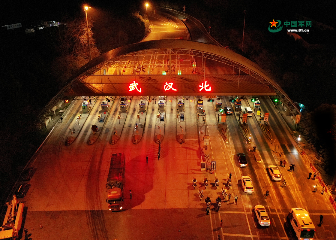 4月8日凌晨,车辆通过武汉北高速收费站(无人机照片)。解放军报记者 王传顺 摄