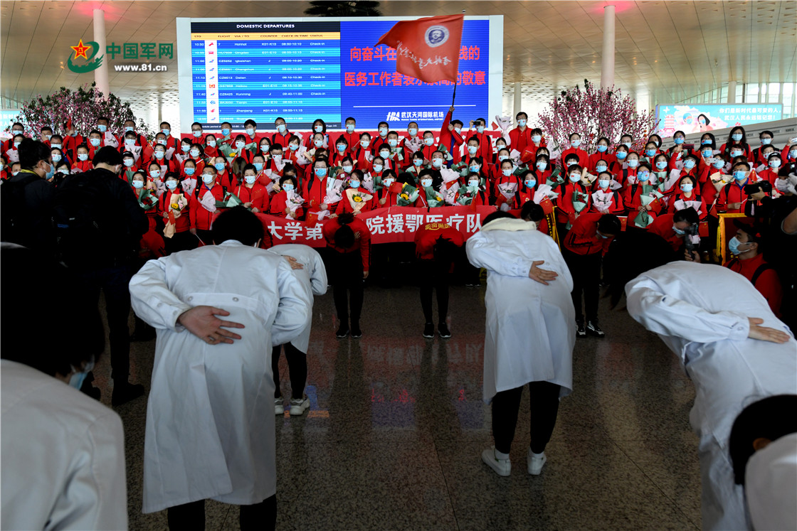4月8日上午,吉林援鄂医疗队撤离武汉,武汉同济医院中法新城院区的医护人员与队员们互相鞠躬致谢。解放军报记者 王传顺 摄