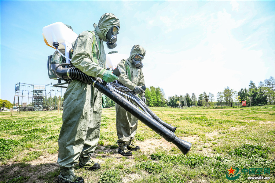 防化洗消员利用背负式洗消器进行洗消作业。李岩 摄