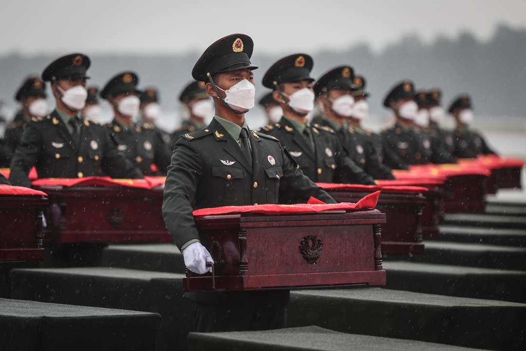 9月16日,在沈阳桃仙国际机场,礼兵将殓放志愿军烈士遗骸的棺椁从专机上护送至棺椁摆放区。新华社记者 潘昱龙 摄
