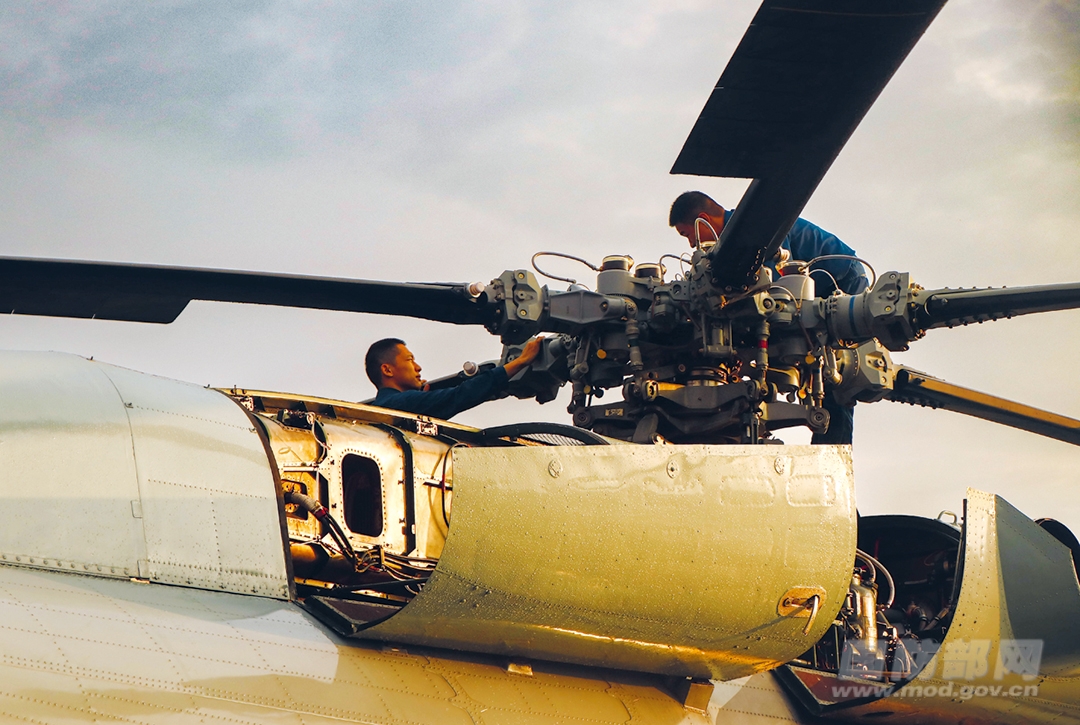 清晨,旭日初升。某军用机场一片忙碌景象,机务官兵正在精心对战机进行检查维护,做好训练准备。