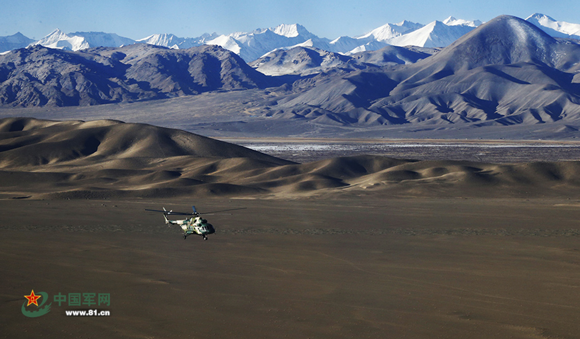 2017年2月22日,新疆某陆航旅直升机对位于喜马拉雅山脉腹地大雪封堵地区实施空中巡逻。远处雪山层层叠叠,近处山脉连绵不绝。入冬以来,阿里地区多条巡逻道路被积雪覆盖,人员马匹难以到点到位,阿里军分区申请直升机对管控薄弱地区实施空中巡逻,加强边防地区的管控力度。在平时,这漫长的边防线,可是需要边防官兵一步一个脚印走出来的。(刘晓东 摄)