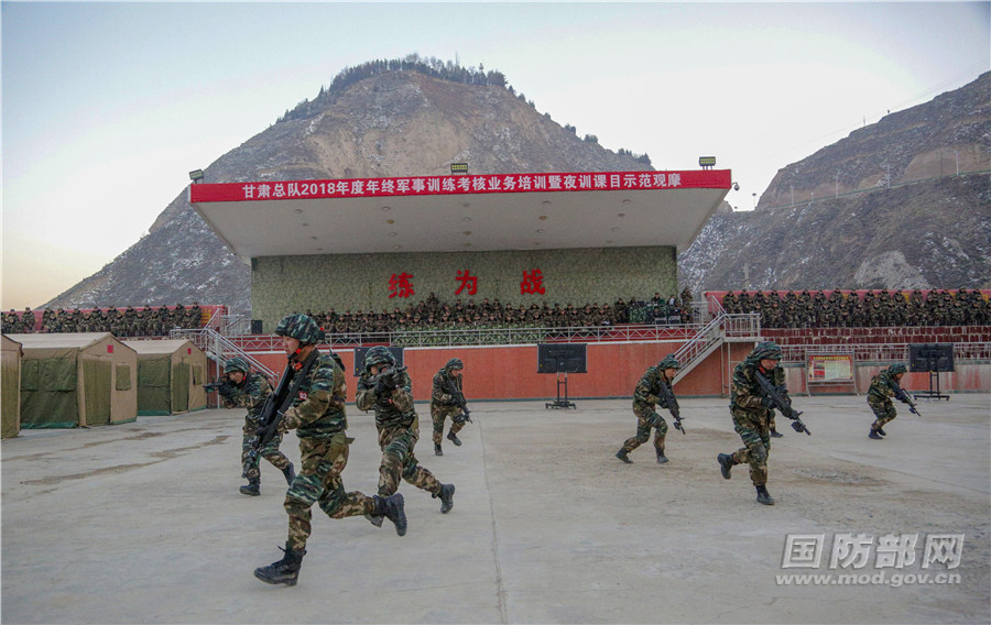 为深入贯彻落实武警部队新大纲集训精神,系统规范军事训练考核和夜间训练程序、方法、标准、动作和保障,教会机关干部如何检查指导军事训练和组织考核,教会部队如何正规施训、规范应考。11月22日傍晚,武警甘肃总队组织进行年终军事训练考核暨夜训课目示范观摩。(曹志刚摄影报道)