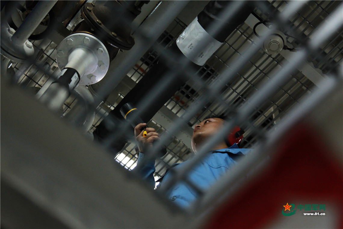 2018年9月下旬,远望21号火箭运输船在长江某水域积极展开演练,这是工作人员检查设备。