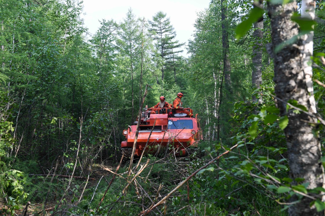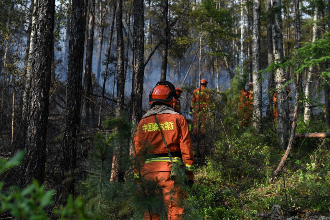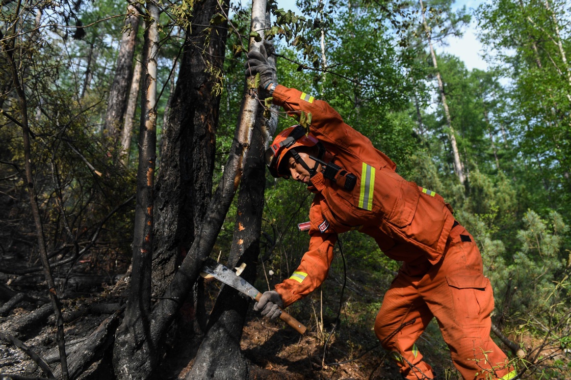 6月22日,成功合围后,呼伦贝尔市森林消防员在秀山林场火灾南线清理火烧过的树木。新华社记者 刘磊 摄