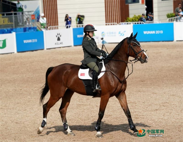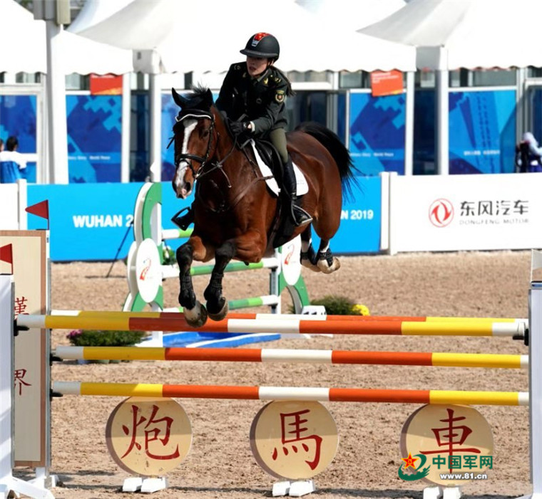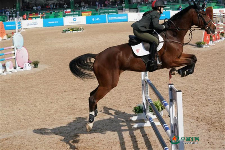 10月21日,世界军人运动会马术场地障碍赛上,中国女选手田羽(下士)在比赛中彰显巾帼风彩。柳军摄影