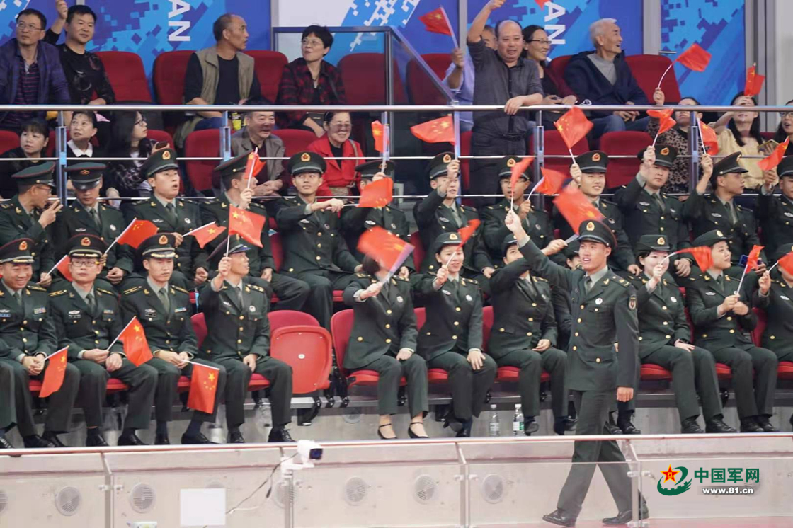 10月21日晚,第七届世界军人运动会乒乓球男团决赛在武汉市五环体育中心体育馆上演。观众席上的官兵为运动员加油助威。中国军网记者 柳军 摄