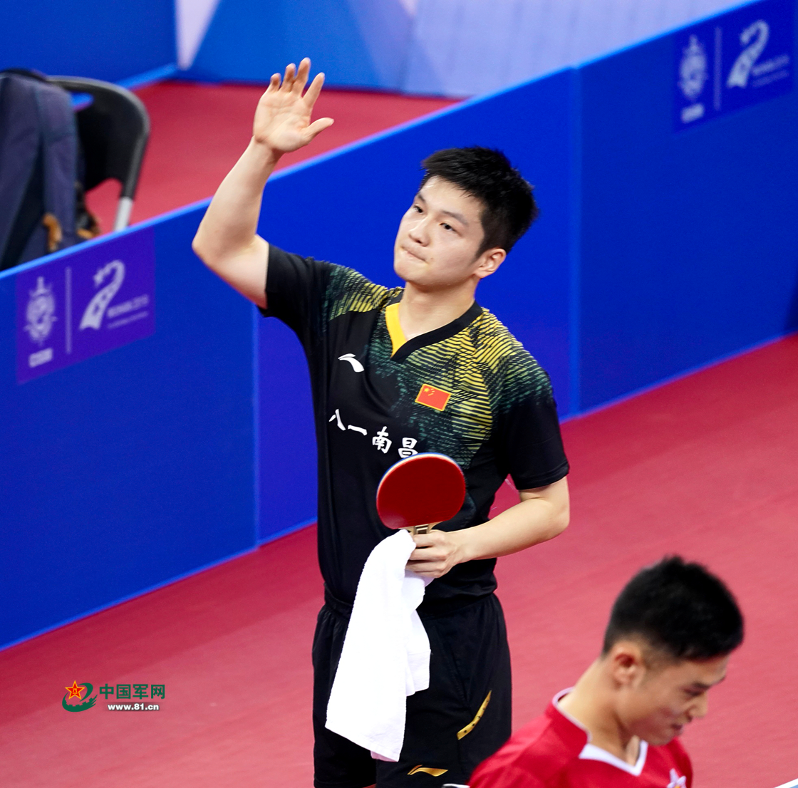 10月21日晚,第七届世界军人运动会乒乓球男团决赛在武汉市五环体育中心体育馆上演,中国乒乓球男团大比分3:1战胜朝鲜队。樊振东在比赛现场。中国军网记者 柳军 摄