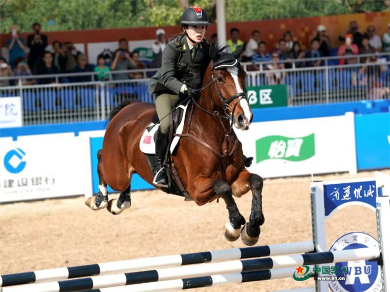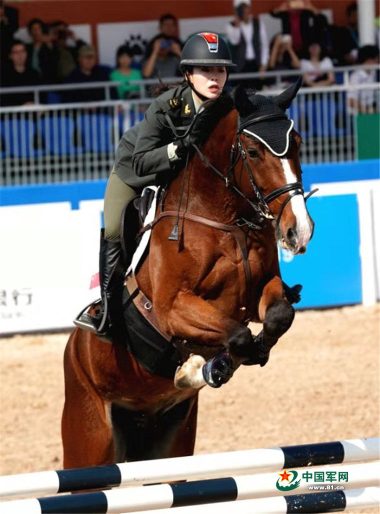 10月21日,世界军人运动会马术场地障碍赛上,中国女选手田羽(下士)在比赛中彰显巾帼风彩。柳军摄影