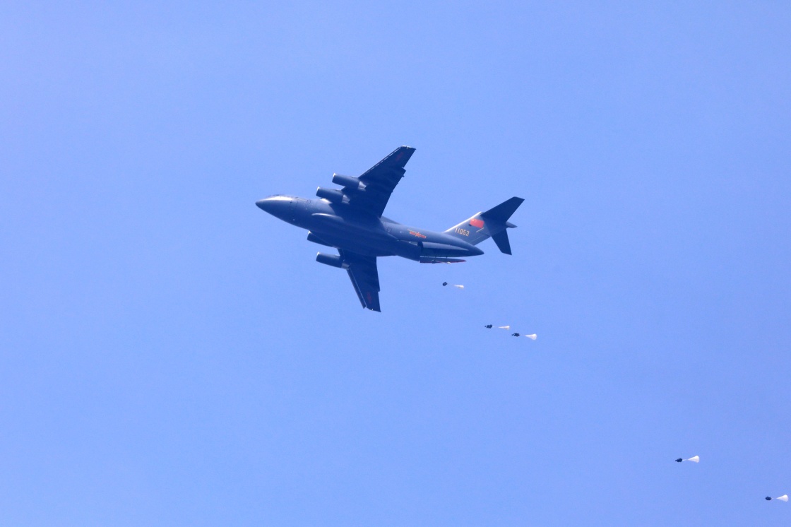 空军空降兵与运-20大型运输机部队联合组织空降训练(2018年4月26日摄)。新华社发(刘冰冰 摄)
