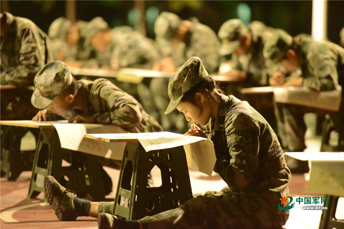 远火排女战士和男兵一起进行夜间识图用图训练。
