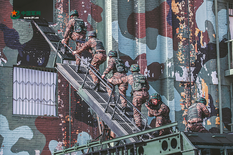 参加反恐演练的特战队员,利用攀登突击车突入“恐怖分子”据点。