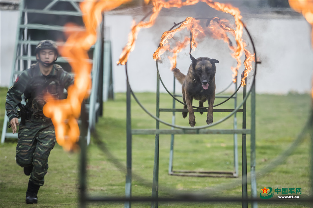 军犬在训导员的引导下进行穿越火障训练。余海洋摄