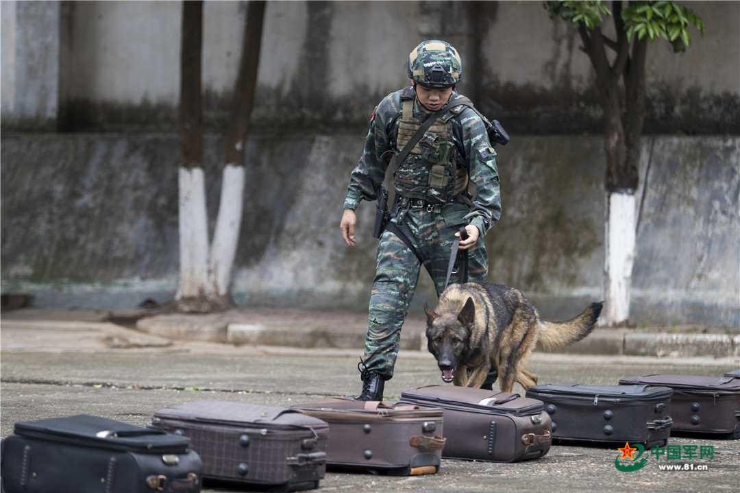 军犬在训导员的引导下进行搜爆训练。余海洋摄