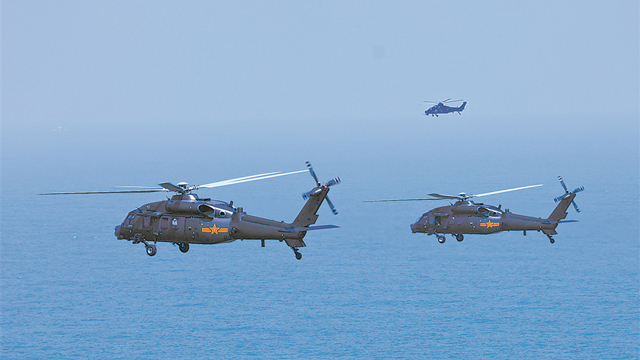 金秋时节,东部战区陆军某旅组织海上编队飞行训练。