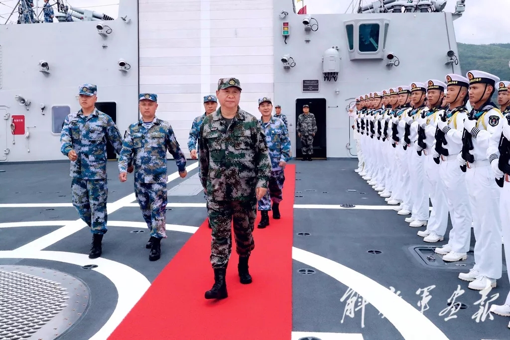 长沙舰舰艇仪仗队再次在飞行甲板整齐列队,以海军特有的礼仪向习近平致敬。