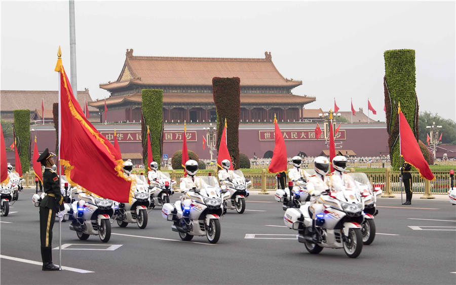 6月6日,摩托车护卫队护卫外宾主车至人民大会堂东门外广场东北口。在外宾主车抵达沿途增设80名手持红旗的仪仗兵旗阵,进一步提升欢迎氛围。