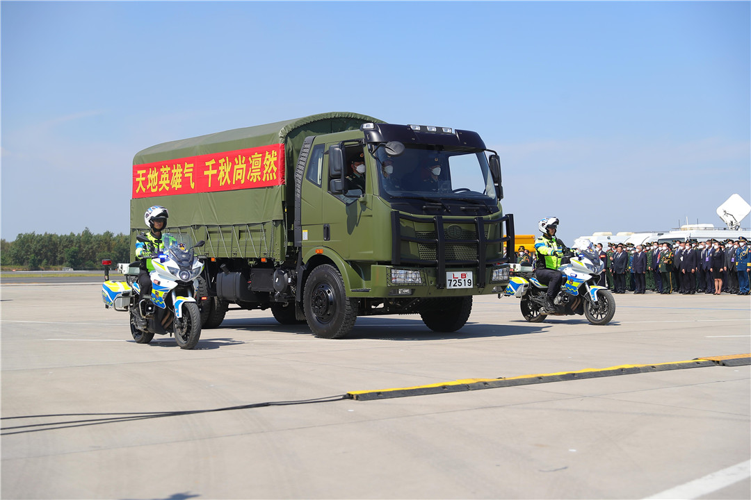 9月2日,载有志愿军烈士遗骸的军用车辆离开沈阳桃仙国际机场。 新华社记者 杨青 摄