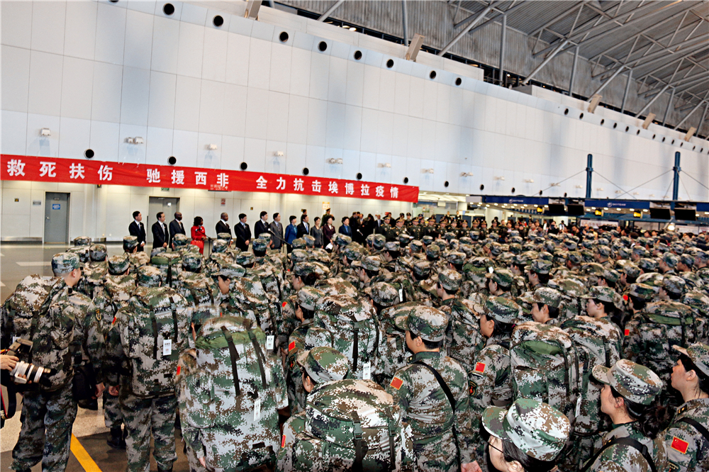 2014年,西非国家爆发埃博拉病毒疫情,波及几内亚、利比里亚、塞拉利昂等国,造成重大人员和经济损失。中国军队抽派7批共524名医护人员执行疫情防治任务,援建诊疗中心1所,收治疑似患者938例,为当地培养医护人员3000余人。图为中国军队医疗队准备出征。