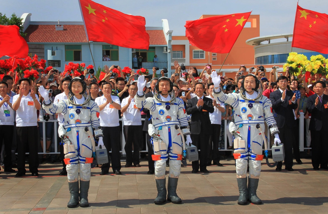 2012年6月16日,神舟九号航天员出征仪式在酒泉卫星发射中心航天员公寓问天阁举行,航天员景海鹏、刘旺、刘洋(从右至左)向欢送人群挥手致意。新华社记者 李刚 摄