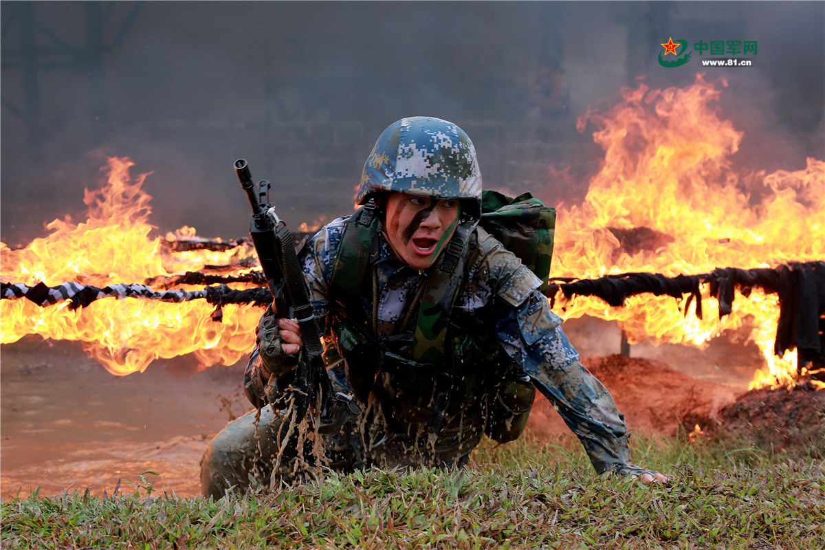 陆战队员穿越泥潭火网。梁景锋 摄