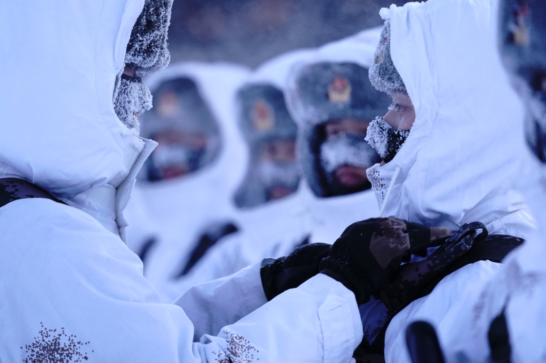 2月5日,驻守在漠河县北极村的北部战区陆军某部官兵巡逻途中检查保暖防护状况。 李刚 摄