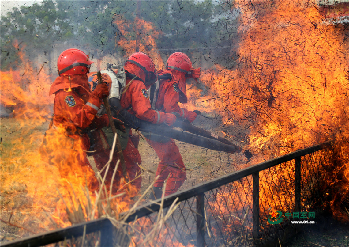 灭火战术训练场,战士们在35℃的气温中同炽热的火焰正面抗衡。