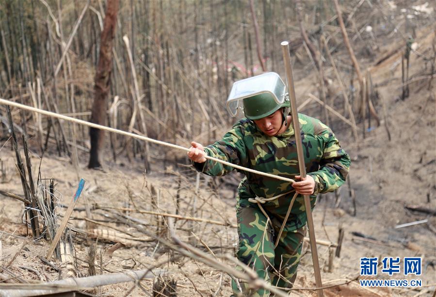 杜富国利用安全绳保护在某高地雷场进行作业(2016年4月27日摄)。新华社发(黄巧 摄)