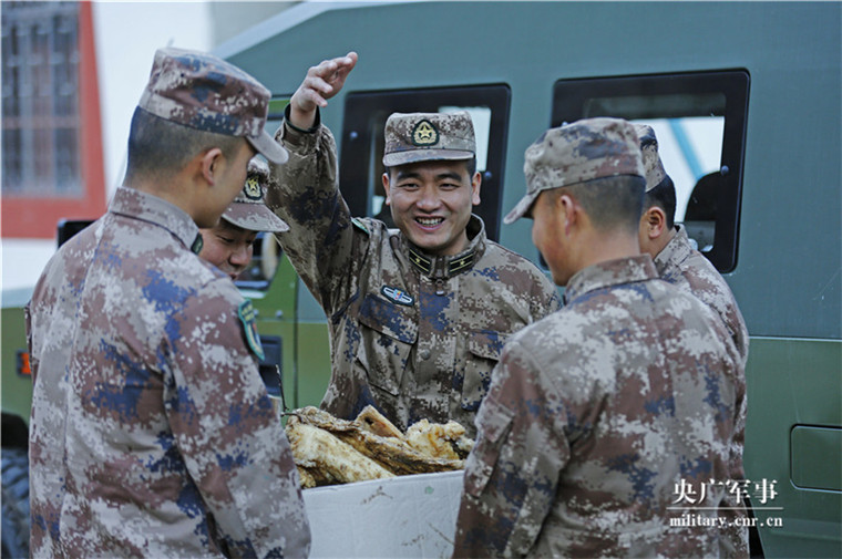 2018年,连队农副业生产大丰收,翁春芳第一时间给德钦哨所官兵送去自制的腊肉。雎心阳 摄