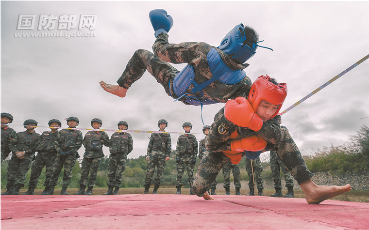 12月9日,武警广东省总队梅州片区第四季度“魔鬼周”火热进行,在搏击对抗课目中,特战队员赖俊明(右)用过肩摔成功制服对手。