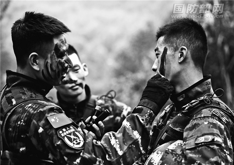 近日,武警广西总队机动支队组织特战队员在野外进行伪装潜行、秘密渗透、红蓝对抗等实战化训练,全面提高特战队员在陌生环境下的综合作战能力。演练前,特战队员们互相涂抹迷彩油。