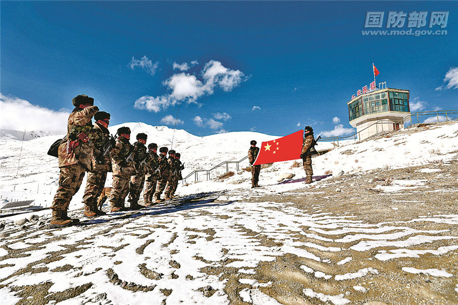 巡逻官兵在前哨班前向国旗庄严宣誓。